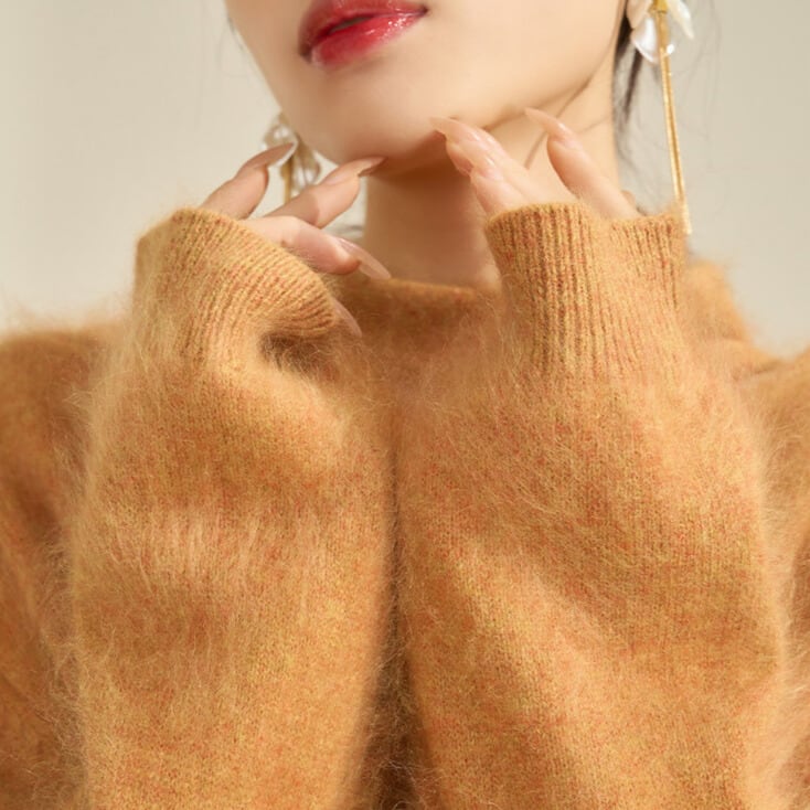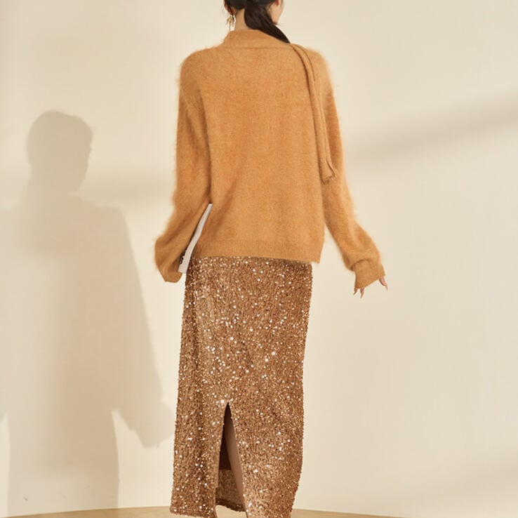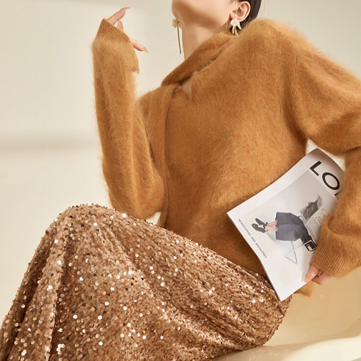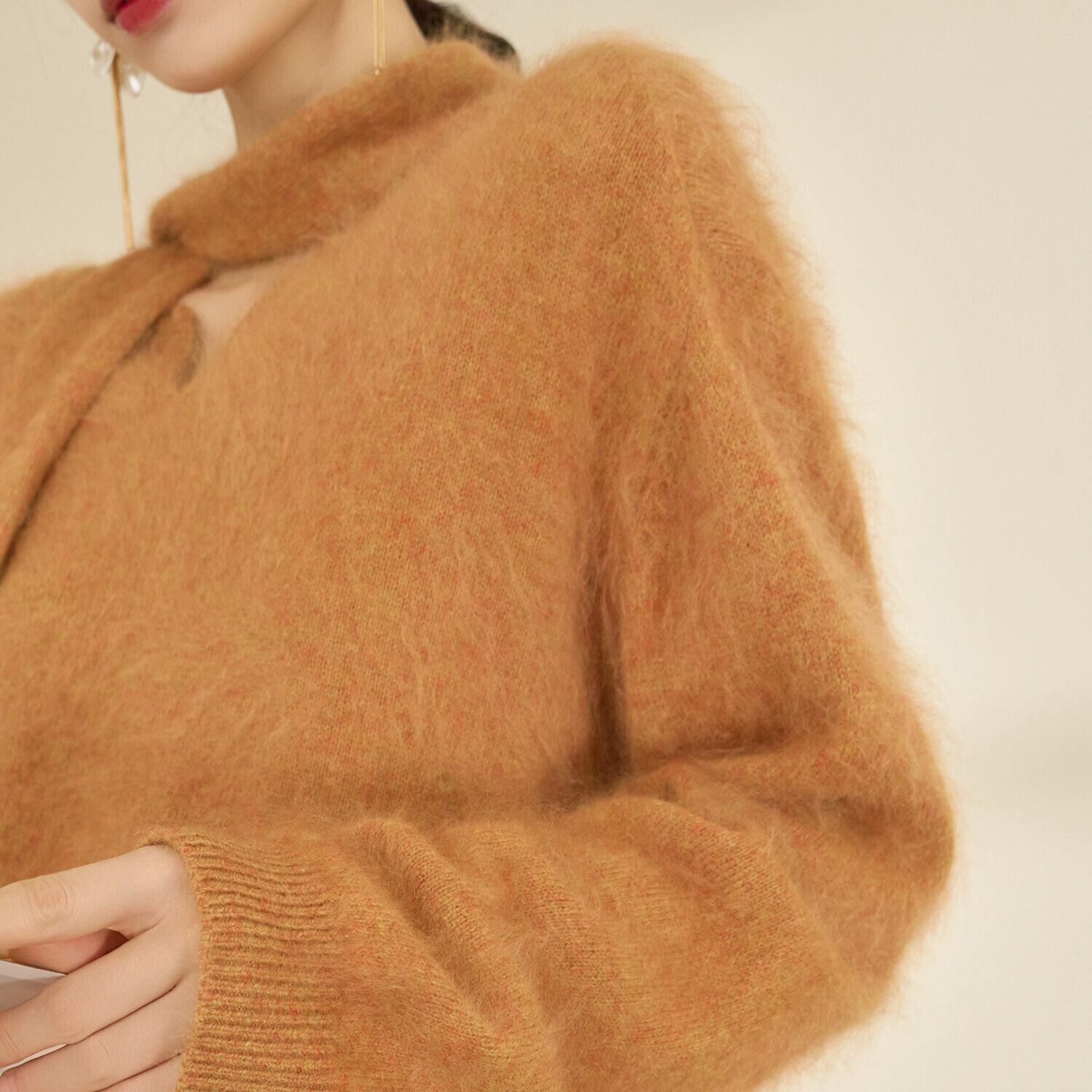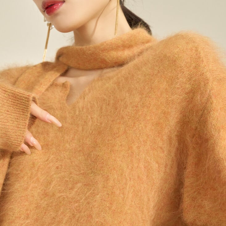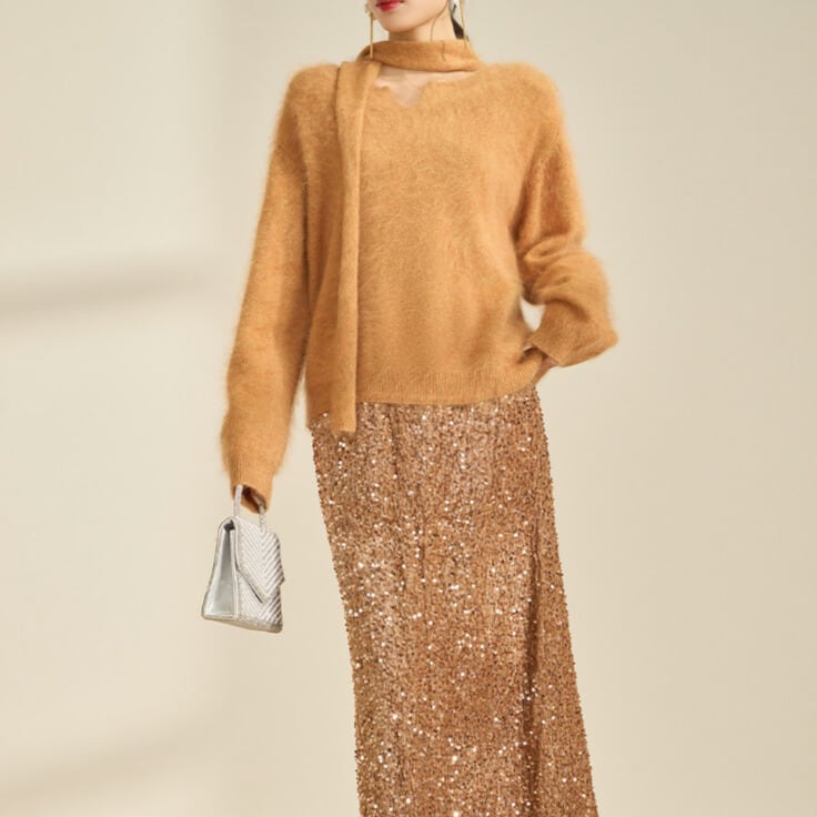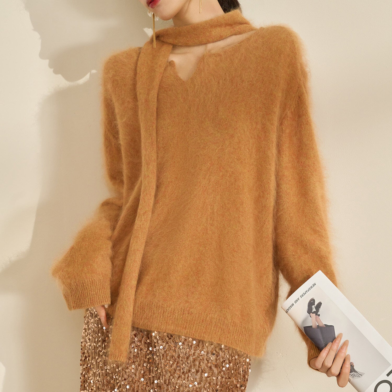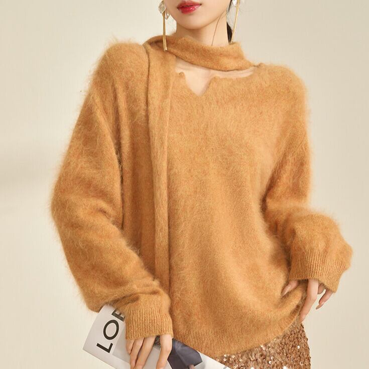 首元のスカーフがエレガントな印象をプラスするニットプルオーバー。