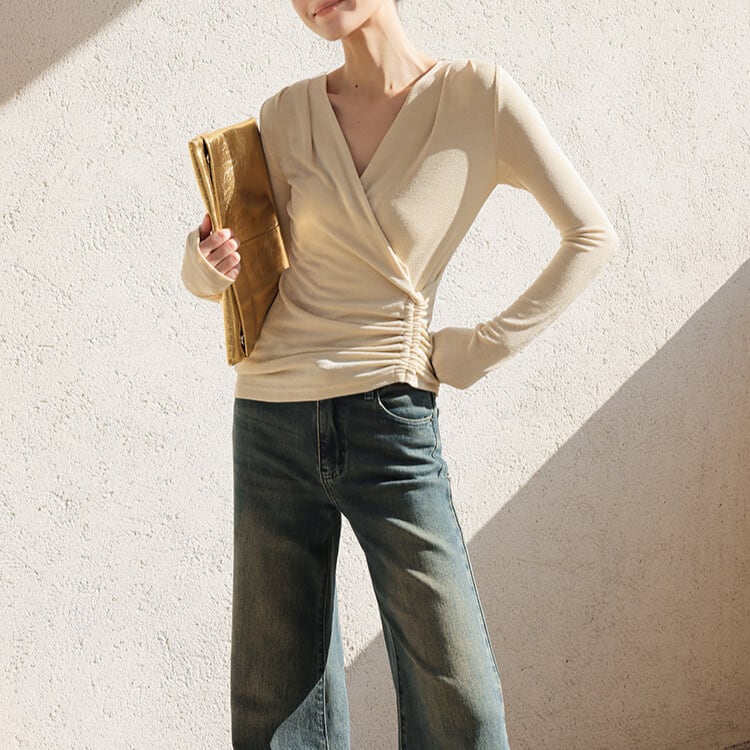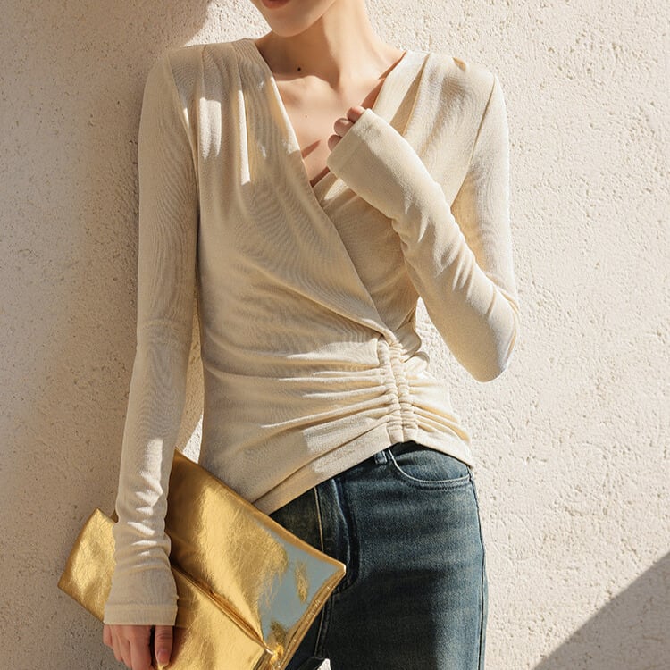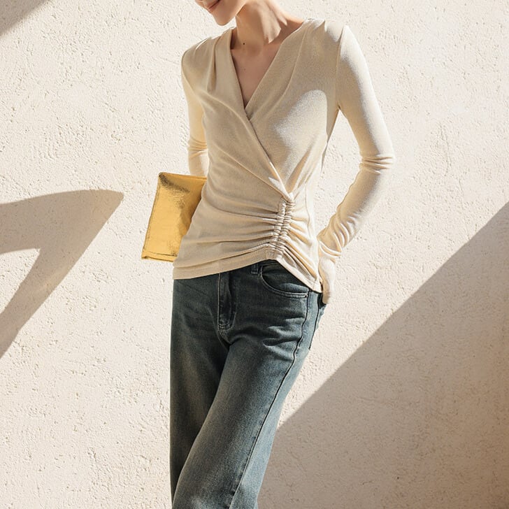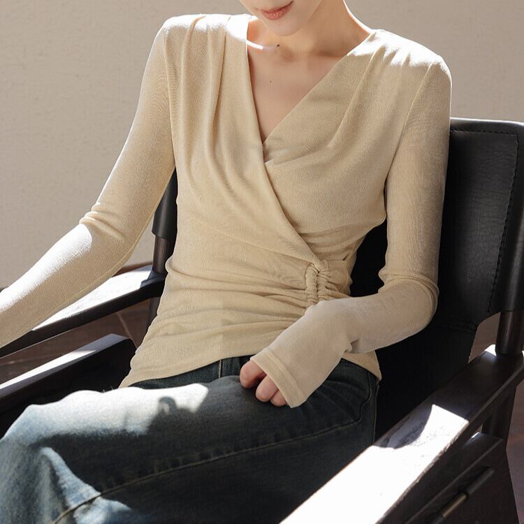 ギャザーがさりげないアクセントとなり、シンプルなボトムスとの相性も抜群。