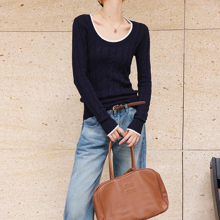 ベーシックなデザインに、配色トリムが映えるリブ編みニット。