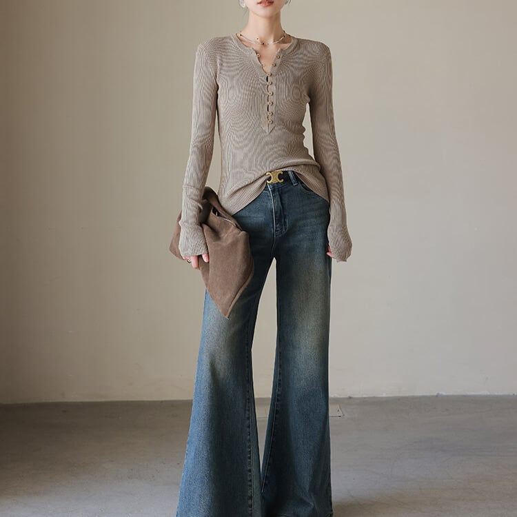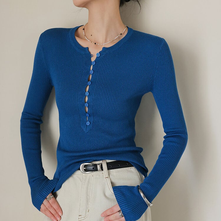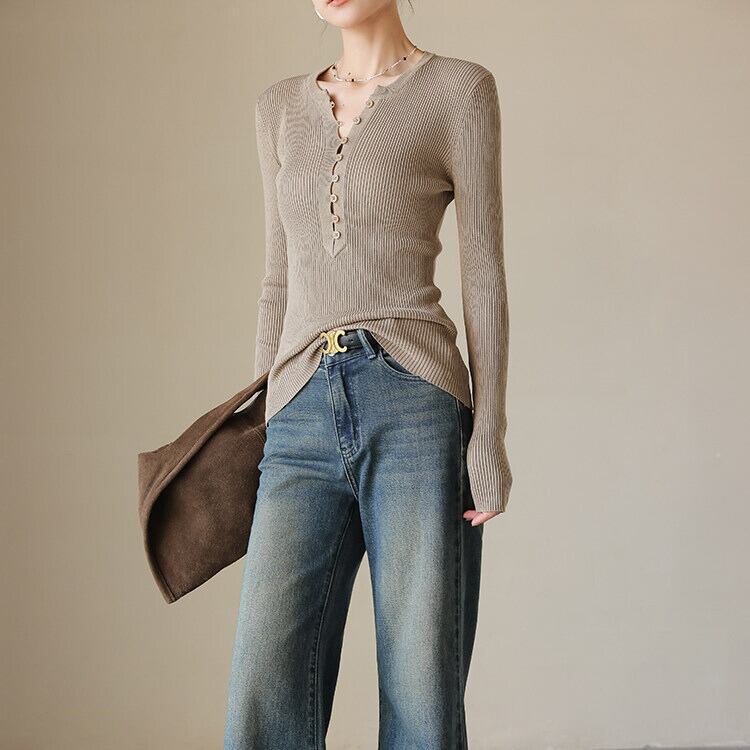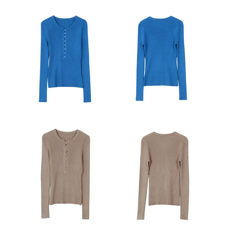 ボタンフロント 長袖 リブ ニットトップス 2col H11195