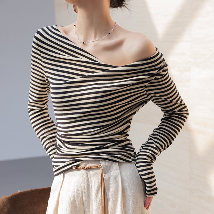 アシンメトリーネックがデコルテを美しく見せ、女性らしさを演出します。