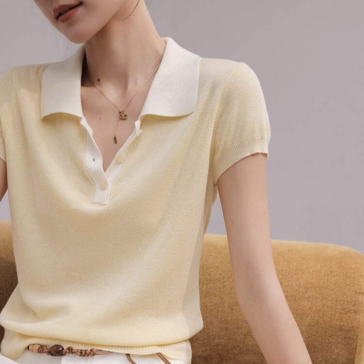 上品な印象と着回しやすさを兼ね備えたニットポロシャツ。