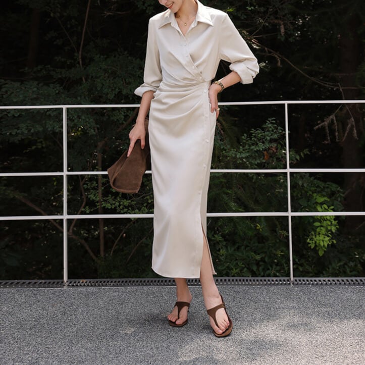 すっきりとしたシルエットで、フロントのスリットが歩くたびに女性らしい動きを演出。