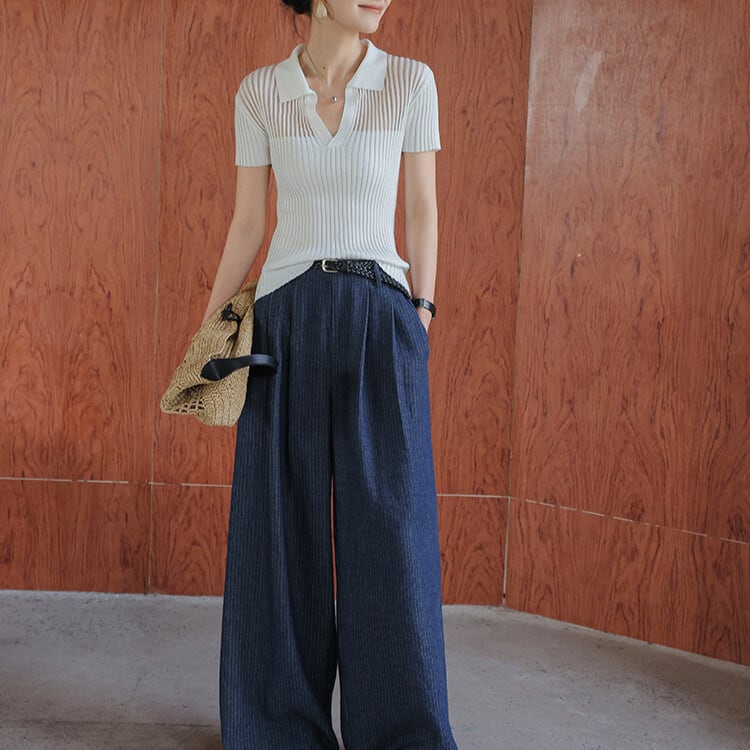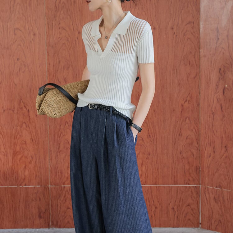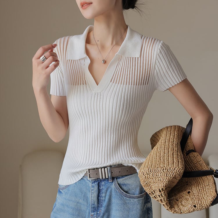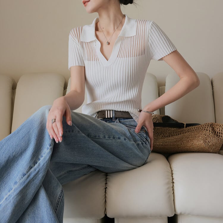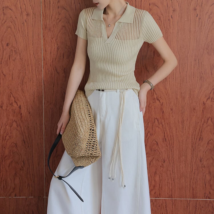 リブ編みが特徴的な半袖ニットポロシャツ。
