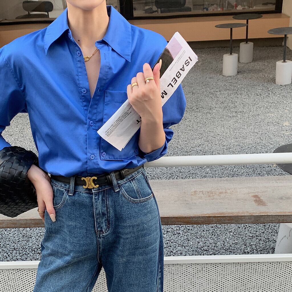首元をすっきりと見せるシャツカラーが、洗練された印象を与えるトップス。
