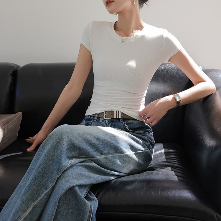 カジュアルながらも女性らしいシルエットを演出する半袖Tシャツ。