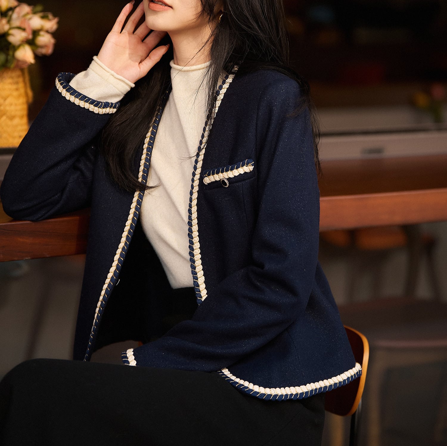 上品な着こなしを叶えるノーカラージャケット。