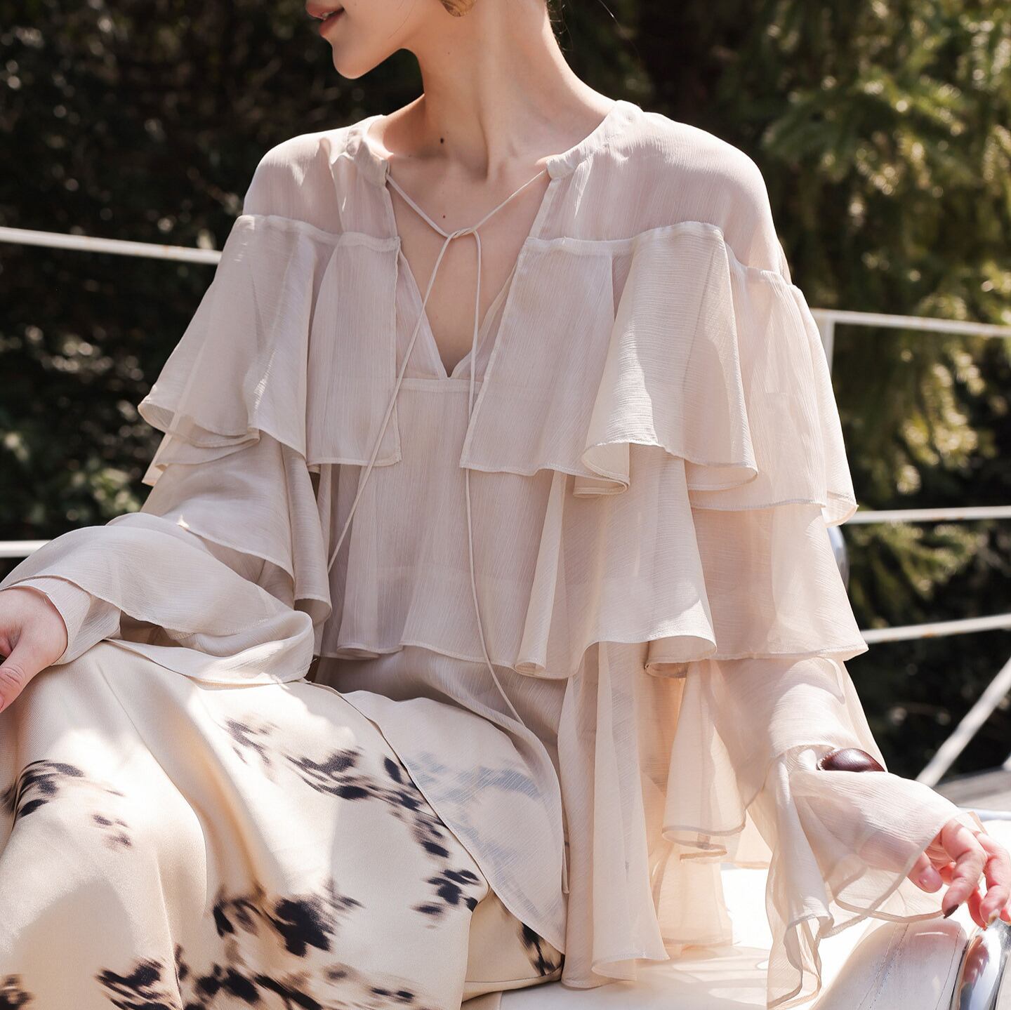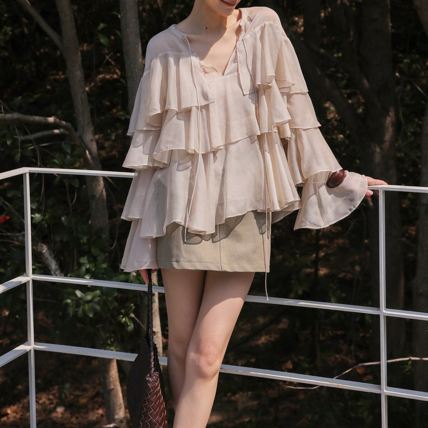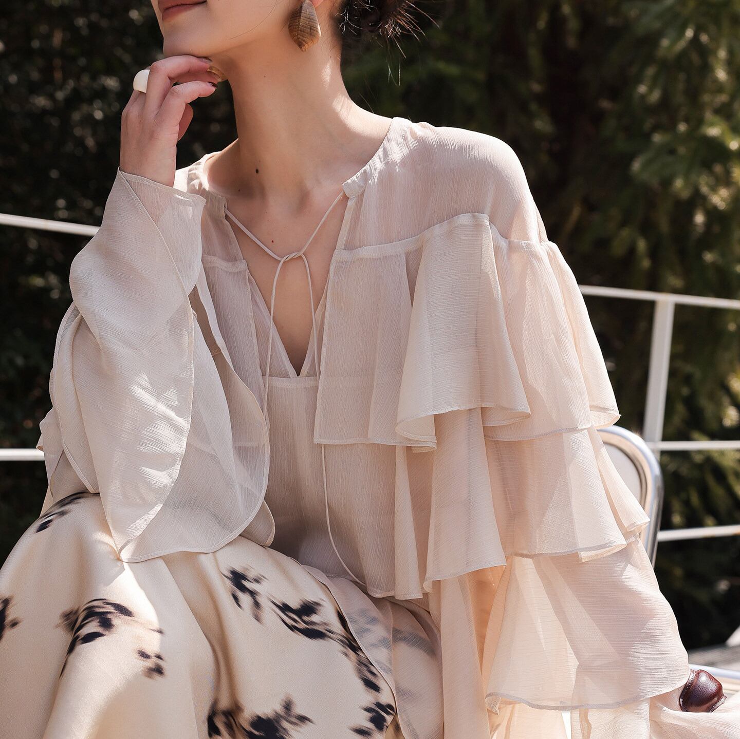 華やかな印象を与えるティアードフリルがあしらわれたブラウス。