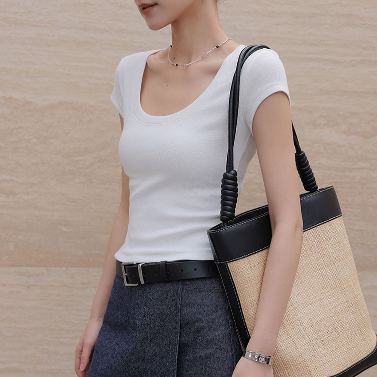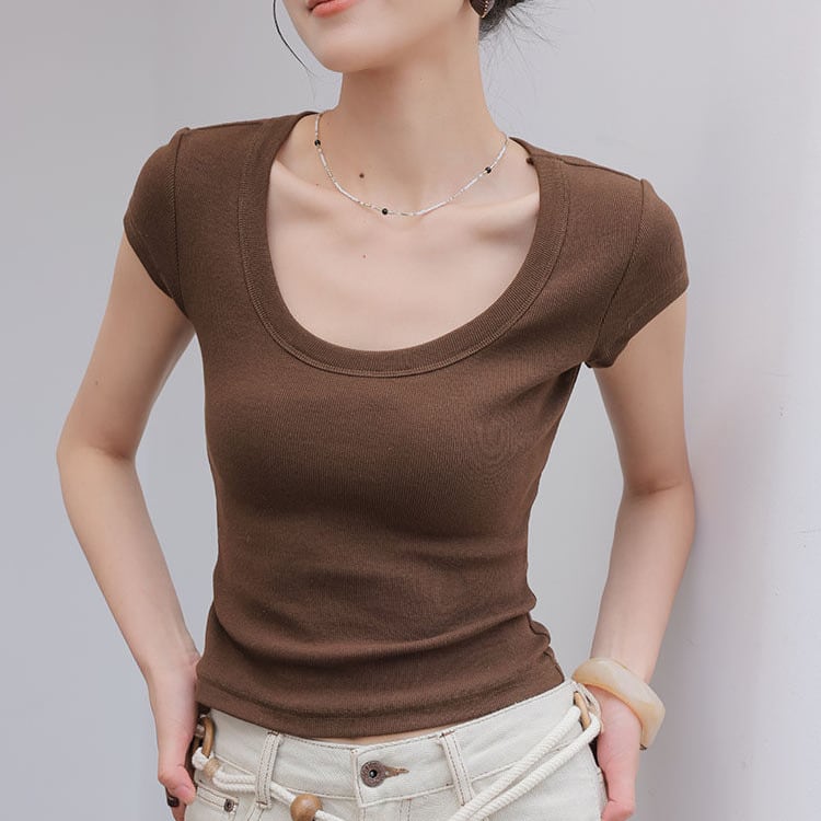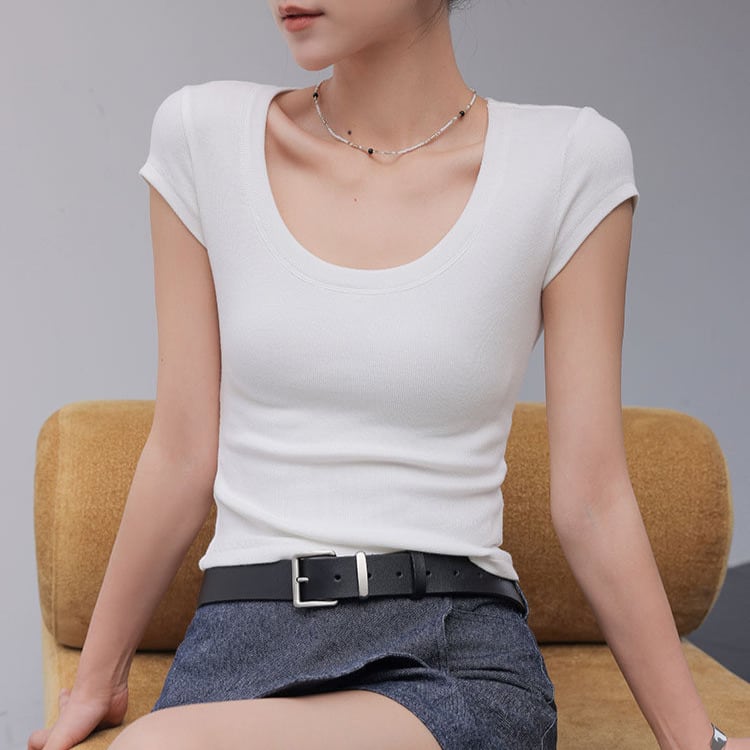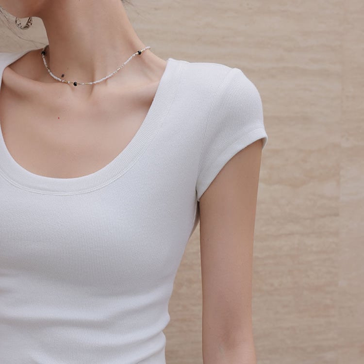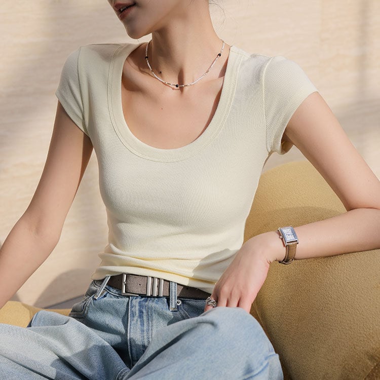 Uネックのデザインがデコルテを美しく見せ、さりげない肌見せがヘルシーな印象を与えます。