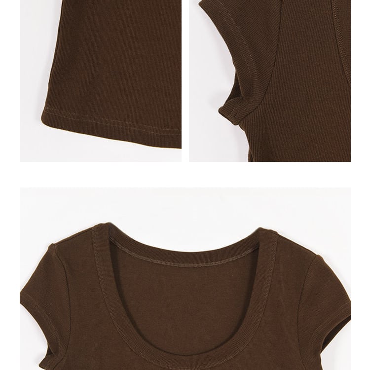 カジュアルながらも女性らしい雰囲気を演出するクロップド丈Tシャツ。