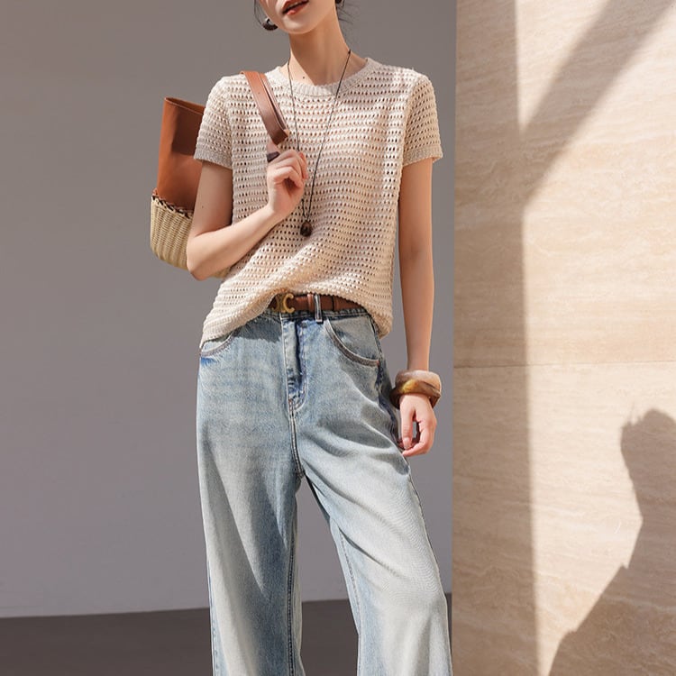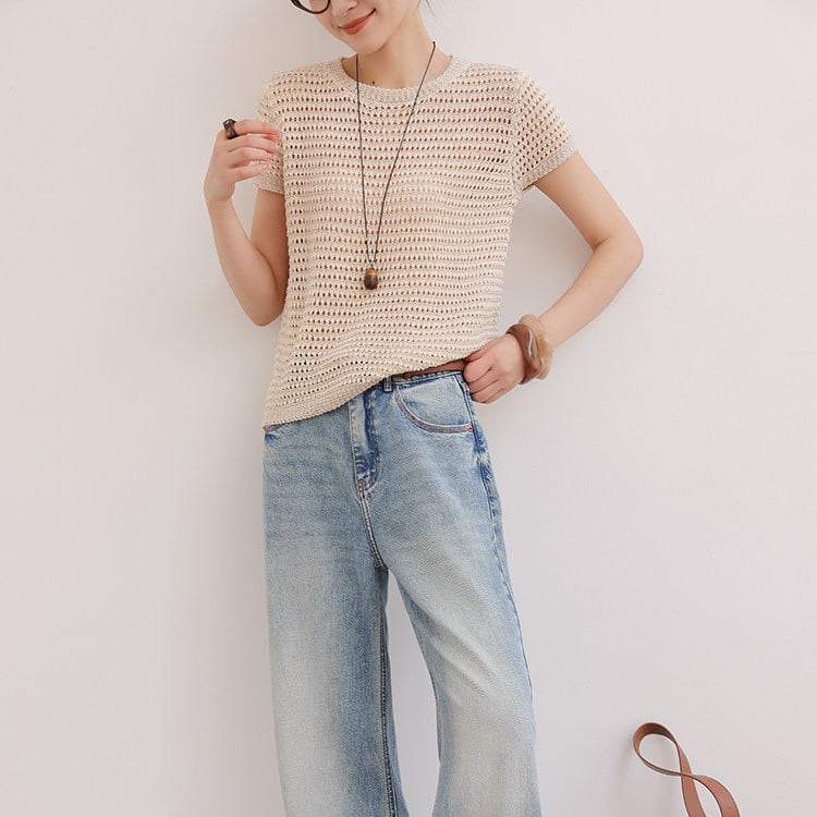 涼しげな印象を与えるハーフスリーブニットトップス。