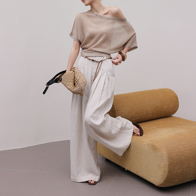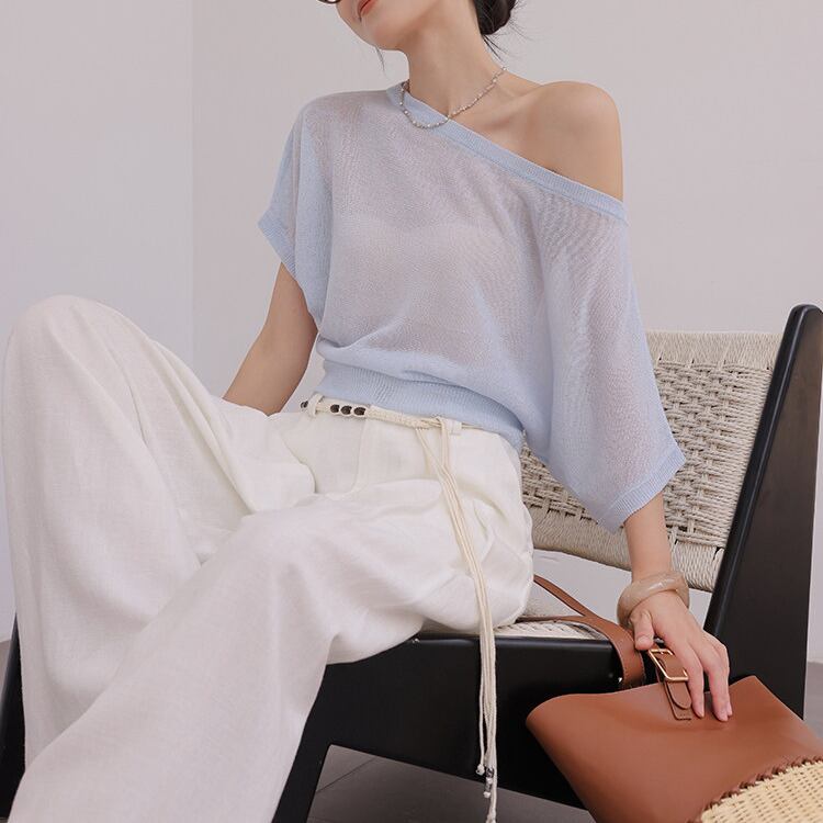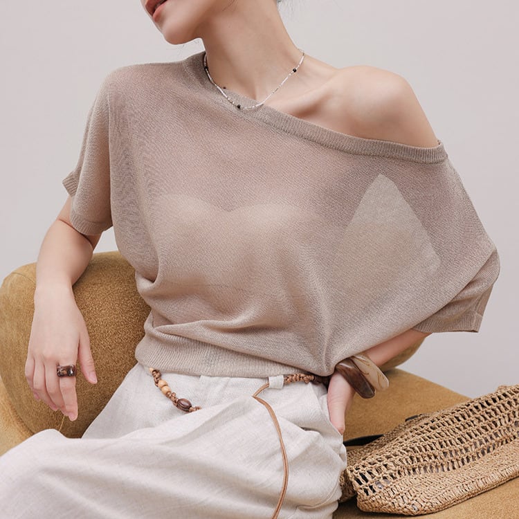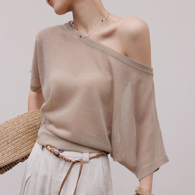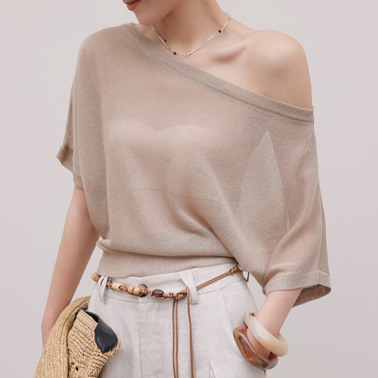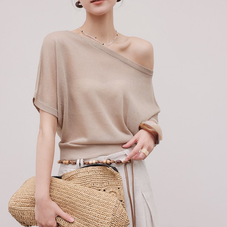 ボートネックのデザインが顔周りをすっきりと見せ、アクセサリーとの相性も抜群です。