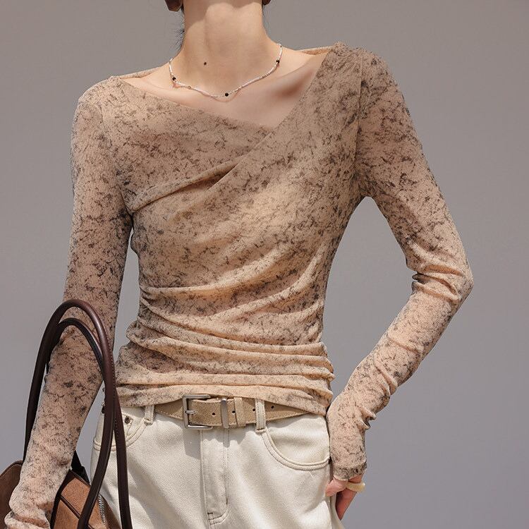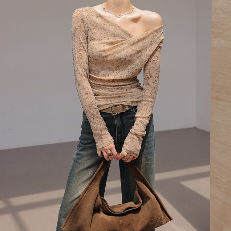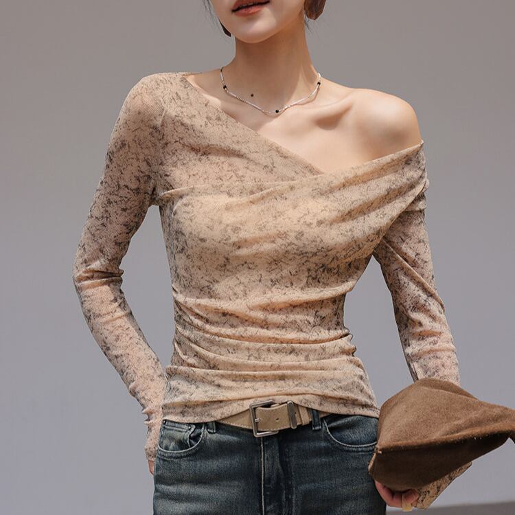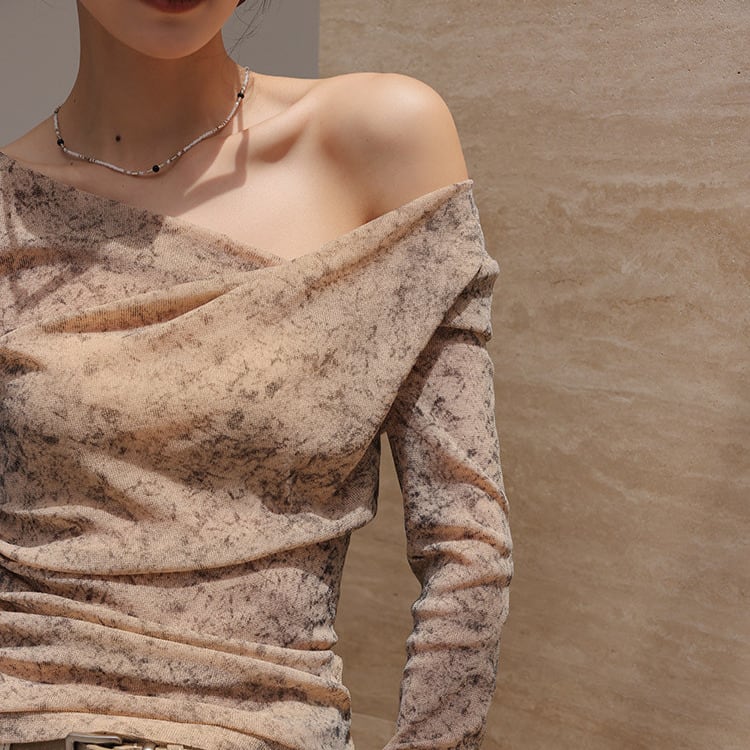 アシンメトリーなネックラインが、抜け感と女性らしさを引き立てます。