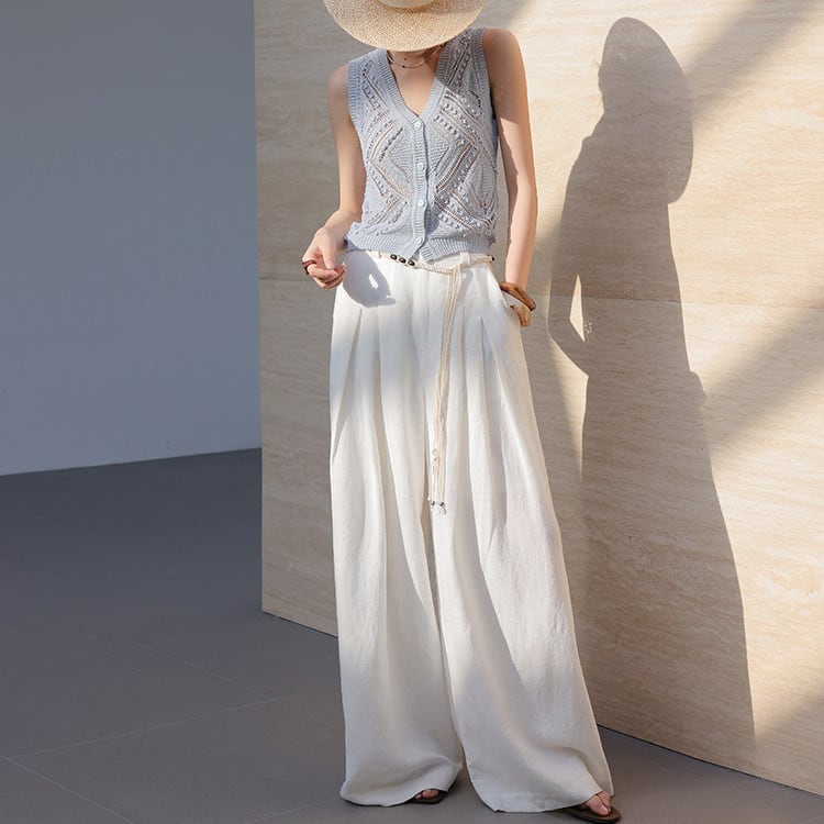 透かし編みのようなディテールが、上品な抜け感を演出し、ラフすぎない大人のスタイリングを叶えます。
