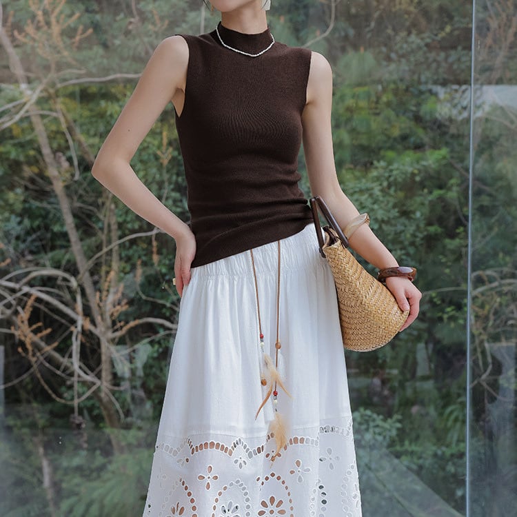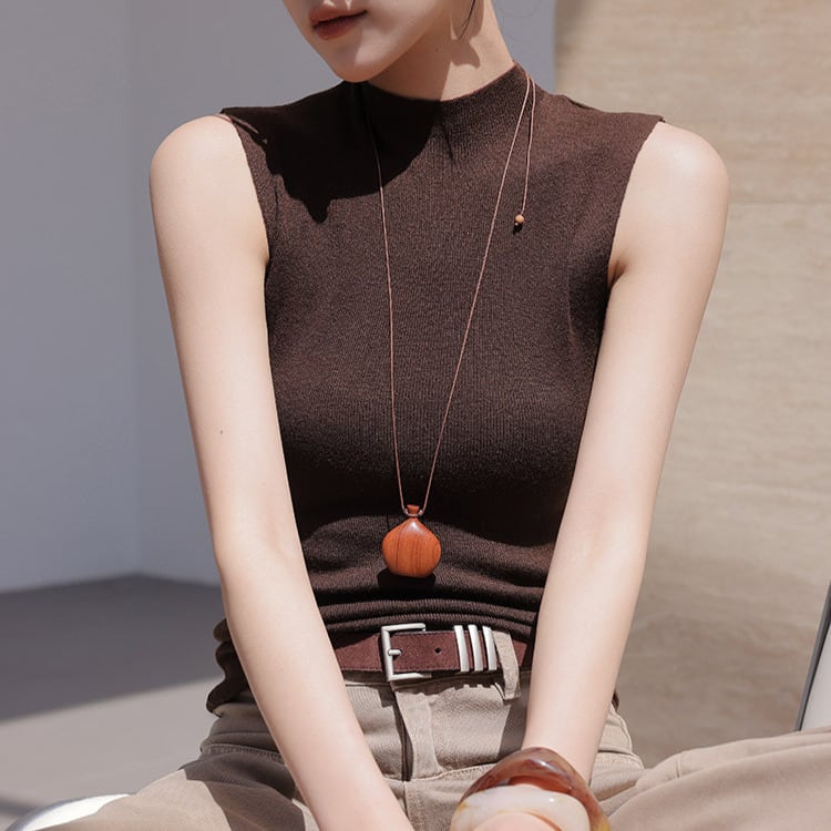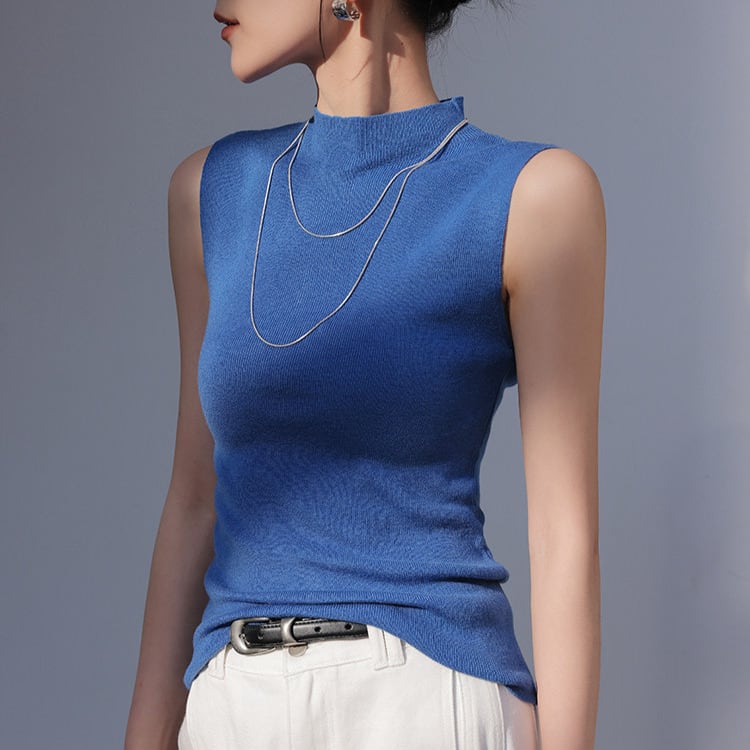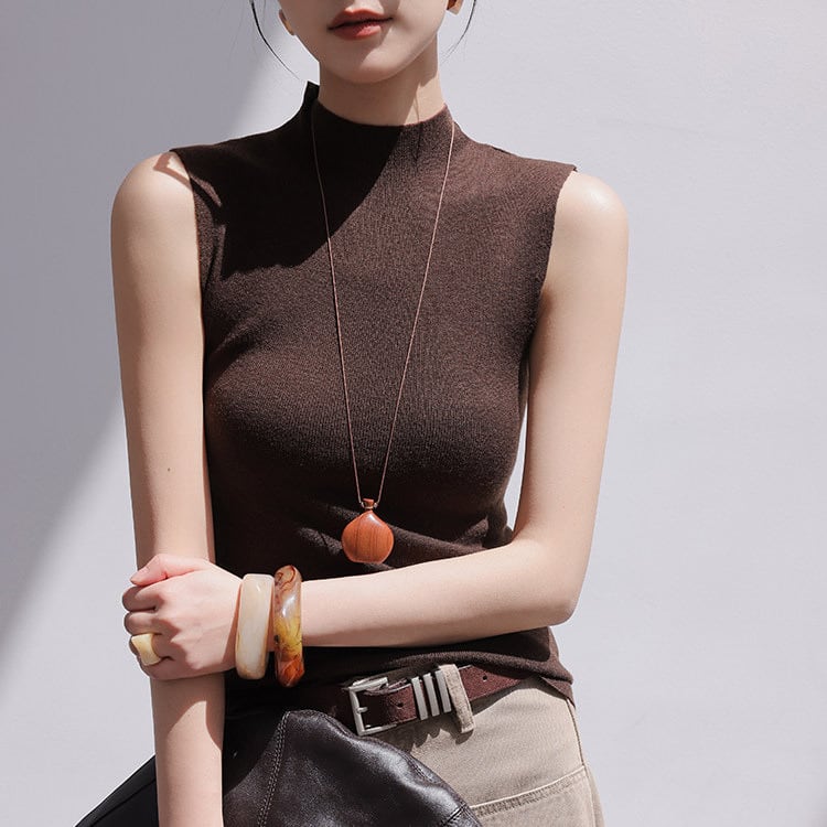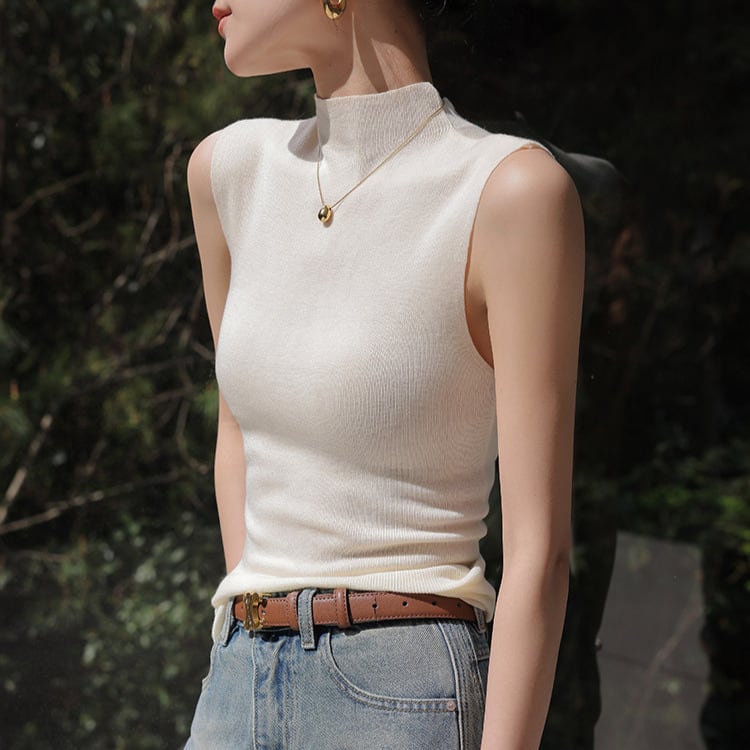 一枚でも、レイヤードでも活躍するハイネックのノースリーブニット。