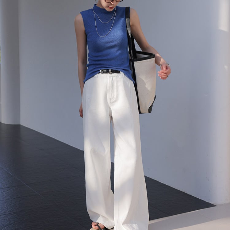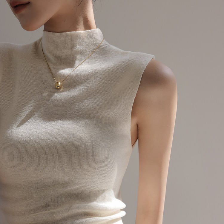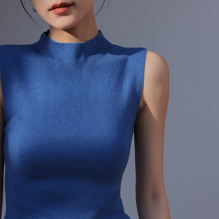 首元をきれいに見せるハイネックと、腕をすっきり見せるノースリーブがポイントです。
